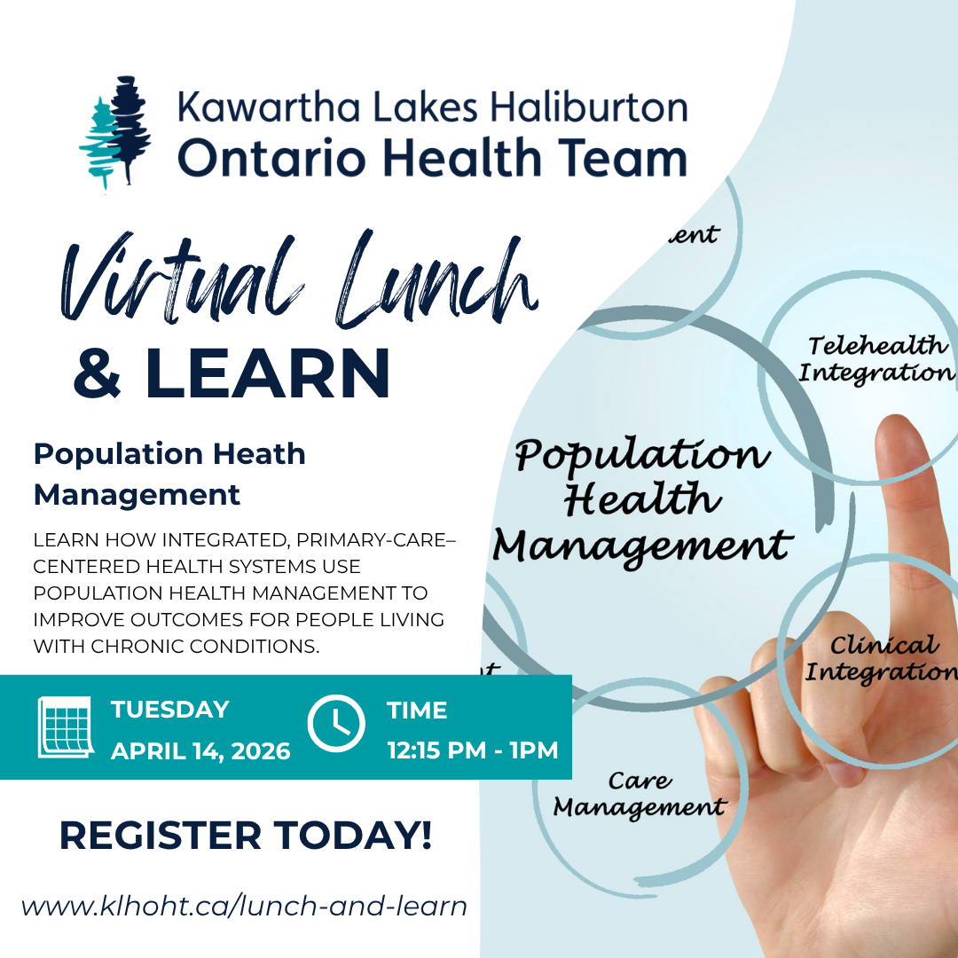 Kawartha Lakes Haliburton Ontario Health Team is a group of healthcare providers and organizations as well as patient, family and caregiver members working together toward a common goal of improving health outcomes.